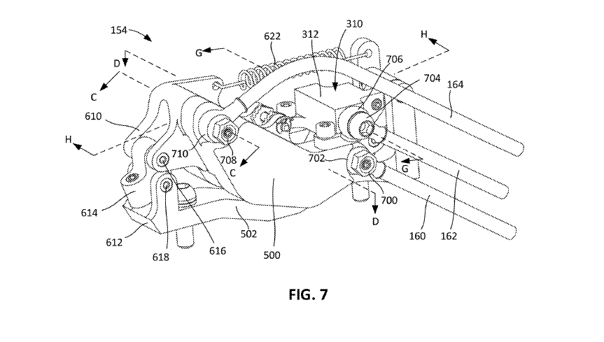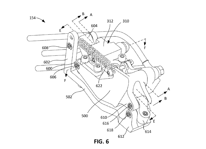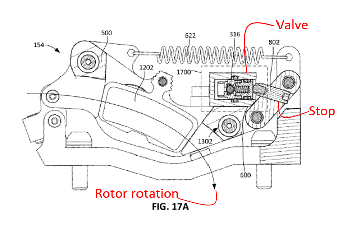 Figures 17A and 18A are the important images here. Valve 316 is the component that controls the flow to the front brake. Figure 17A shows the system in the ‘open’ state, where the fluid flow is open to the front caliper. The arrow shows the direction the rotor is spinning. As the pads grab the rotor, the friction between the rotor and pads allows the caliper to be pivoted forward, and the valve is pressed against the stop 802, and you get dual braking.