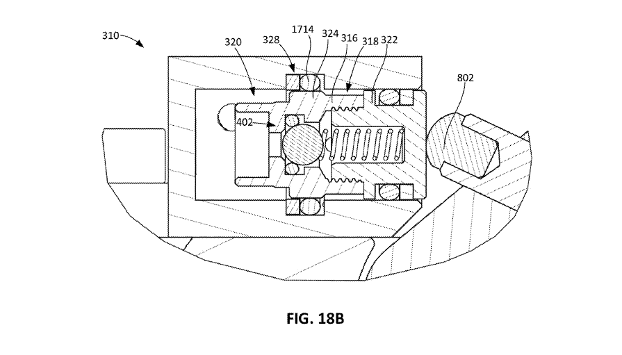 Therefore, the force from the pressure in the neutral cavity 318 acting on the first spool 322 (on the left side of the first spool 322 in FIG. 18B) is greater than the force provided by the stop 802 on the first spool 322 (on the right side of the first spool 322 in FIG. 18B). As a result of this force differential, the [valve] 316 moves to the closed position shown in FIGS. 18A and 18B.