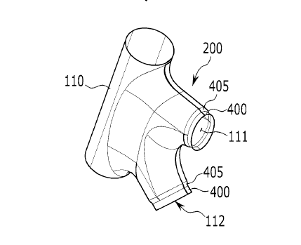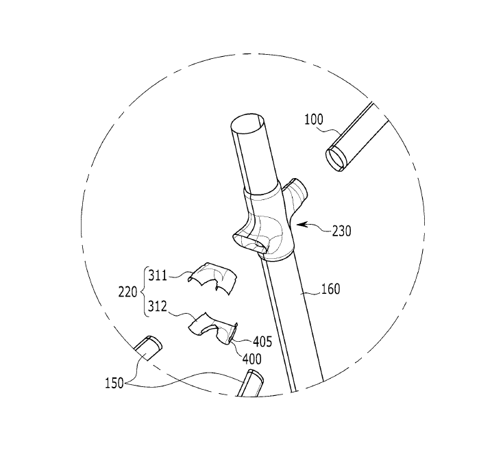 Hyundai are introducing a new design-for-manufacturing bike lug system. In the case of this bike, the lugs are the head tube, bottom bracket, the chain stay junction, and the seat stay junction. For example, the head tube is made with 2 symmetrical pieces and bonded together. Then, the top and down tube are inserted around the “diameter reduction portion” 405 and welded to the head tube. It’s an extremely simple process for, I’m assuming, very mass produced bikes for markets like China.