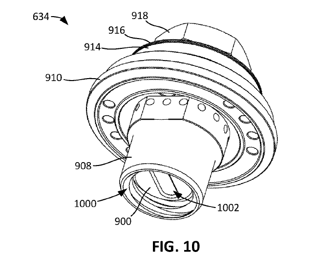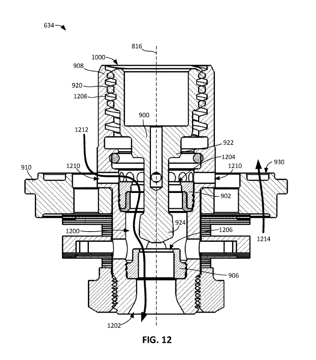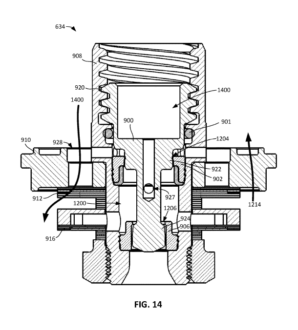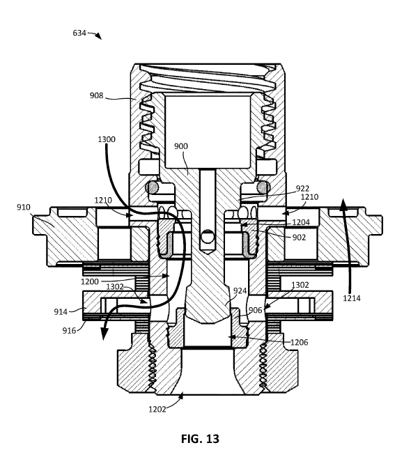 There is a unique feature here, where the flow control member 634 can reduce the pressure differential on the plug 900. Therefore, there is a more balanced fluid pressure in the system so it takes less force to move the plug. Check out paragraph [0088] in the spec for a deeper dive into this.