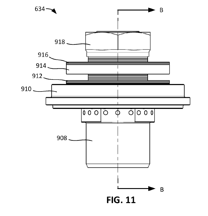 FIG. 8 shows a cross-section of the valving. I’ll be honest; there is so much shit going on here that I’m going to skip most of it. All you need to know is when the controller tells the shock to adjust damper fluid flow, the motor (not shown, it’s in the controller from FIG. 4) rotates the actuator 408, which rotates the plug 900, and the plug moves linearly, allowing more or less fluid to flow.