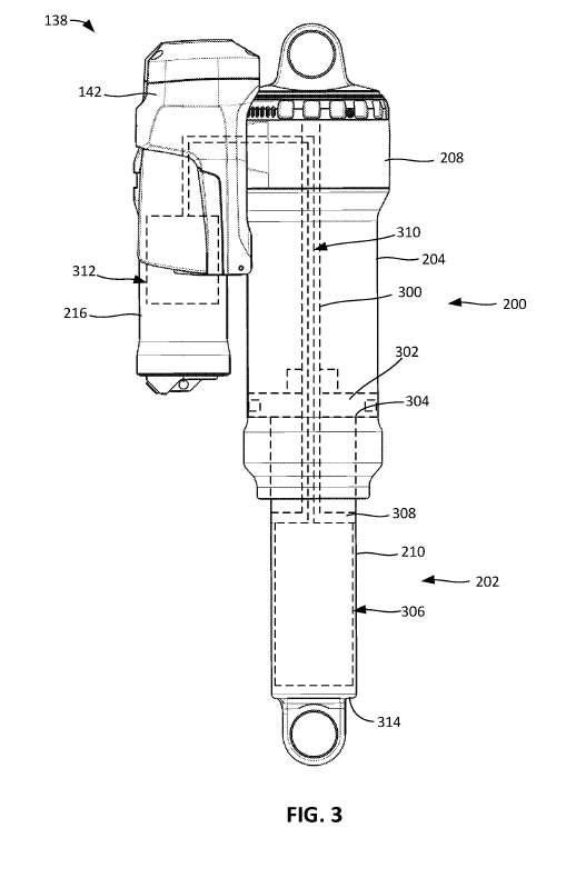 FIGs. 2 shows this new shock and FIG. 3 shows fluid communication pathways throughout the shock. 310 is the fluid path. Almost everything appears to be typical, except for that thing on top of the piggyback. Component 142 is the controller, and this will control the fluid adjustments on this shock. The wireless system, memory, processor, and motor are all inside this controller. Note the button 220. That is the activation button. You can turn the system on/off or toggle through damper modes with that button.