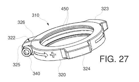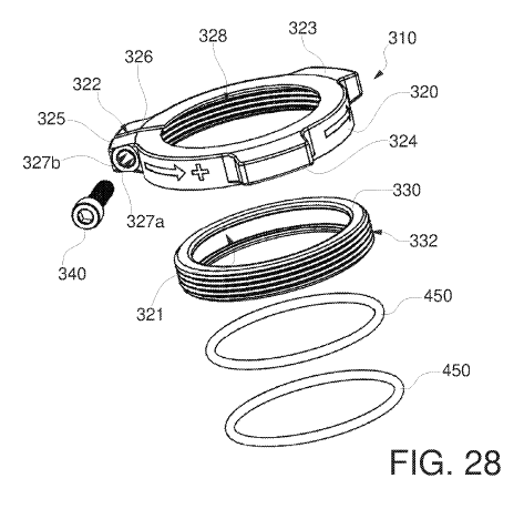 So, how does this headset tightener work? FIG. 27 shows the assembly… assembled. FIG. 28 shows an exploded view. We’re focused on tightener 310 and threaded inner ring 330. Both of these parts are assembled and slid onto the steerer prior to installing the stem. The O-rings 450 apply friction to the steerer. Again, the whole system is pushed together by hand and the stem is tightened. Then, you’ll just turn the tightener 310 to apply pressure to the bottom of the stem. The O-rings should keep the inner ring from spinning. I imagine the O-rings will end up being very consumable. The screw 340 is then tightened to not allow the tightener to loosen.
