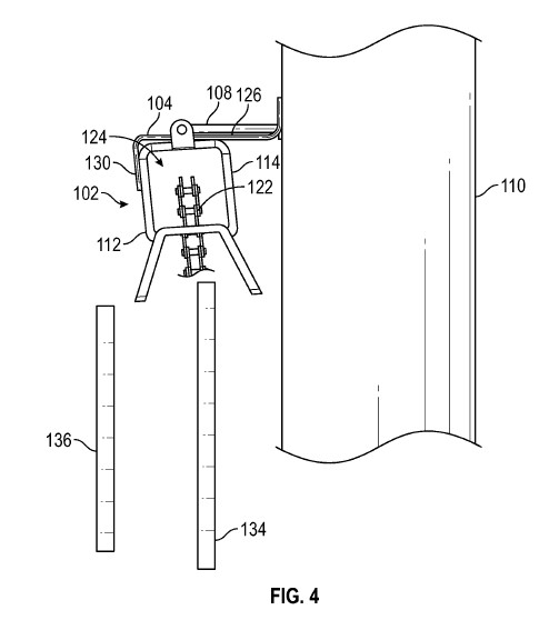 FIG. 1 shows the entire system. 110 is the seat tube and I’m sure you can tell where the derailleur is. The important parts here are moldable wires 104 and 106. These wires are attached to the chain guide at sections 130 and 132.