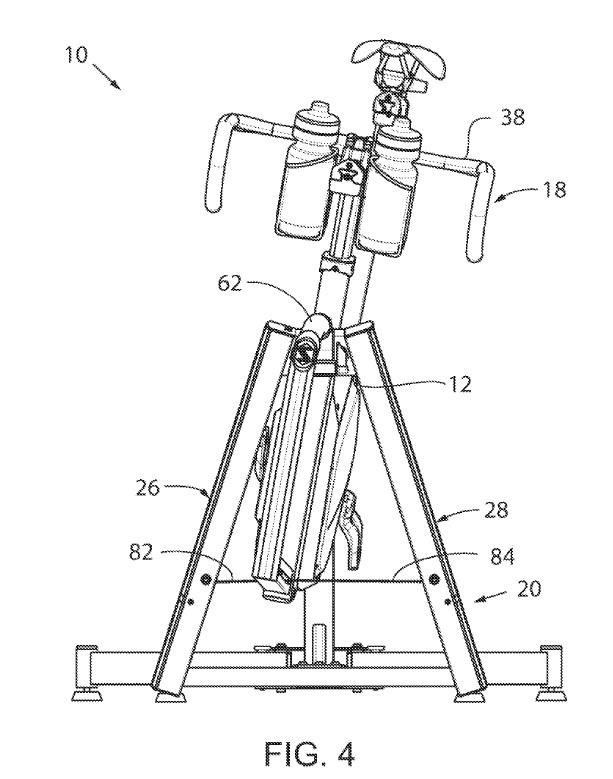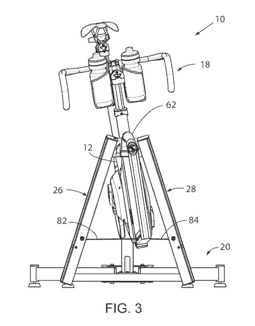 FIG. 2 shows an iso-view of this new stationary bike trainer system. First, let’s talk high-level stuff. The seat is adjustable both up/down and fore/aft, so you should be able to get it situated to your liking. The handlebars appear to be mounted via a traditional stem bolt structure, so you can put your own bars on it. The bars can also be adjusted both up/down and fore/aft. That’d be insane if they weren’t adjustable like this.